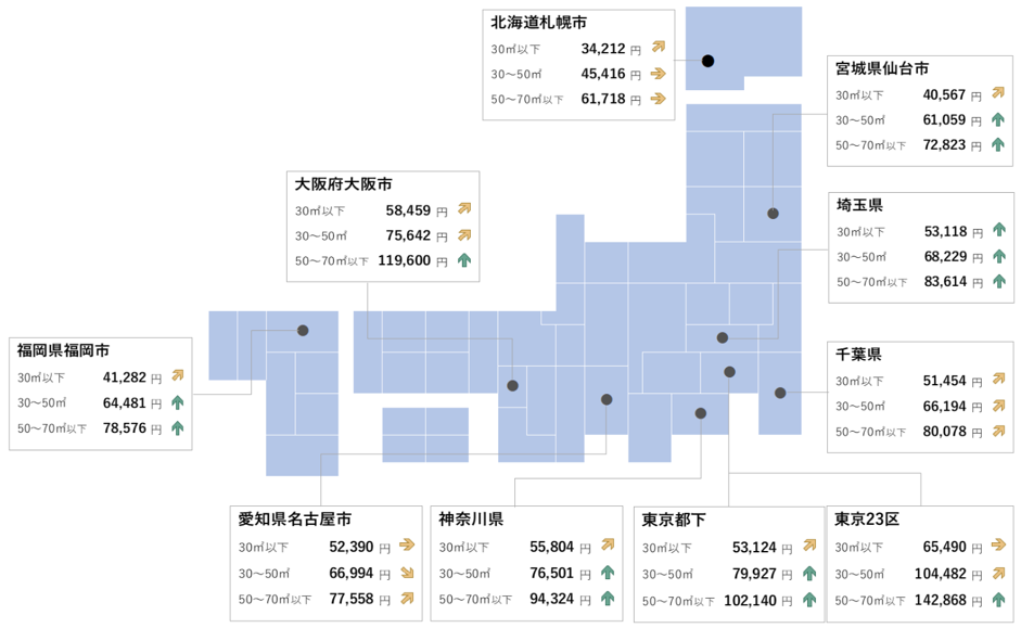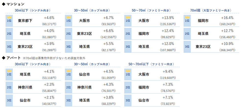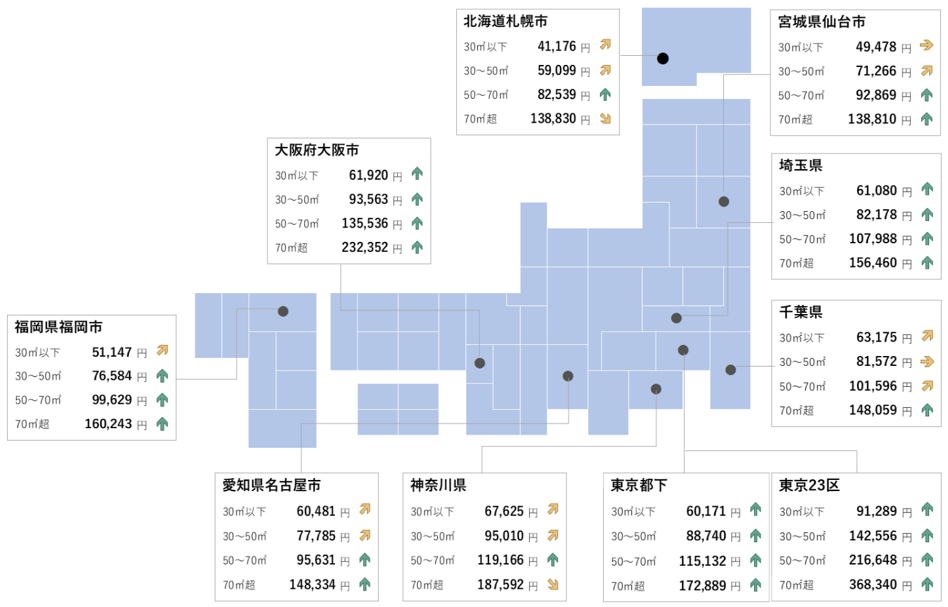 マンションの平均募集家賃は、東京23区・東京都下・埼玉県・仙台市・名古屋市・大阪市・福岡市の7エリアが全面積帯で前年同月を上回る。