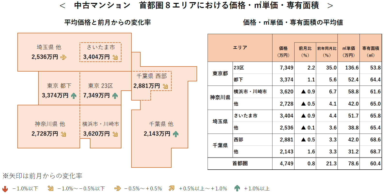 ◆首都圏の中古マンション1戸あたり平均価格は4,749万円。前月比、前年同月比ともに13カ月連続で上昇。