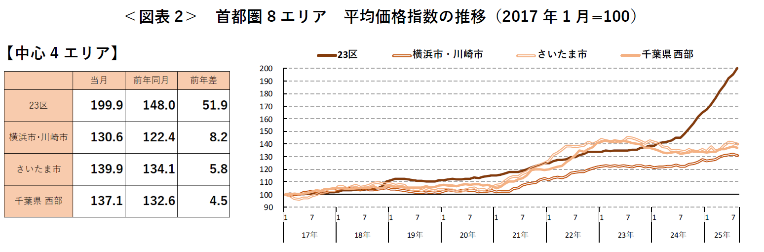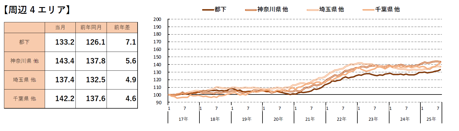 ◆東京都(23区/都下)、千葉県他の3エリアは2017年1月以降最高額を更新。