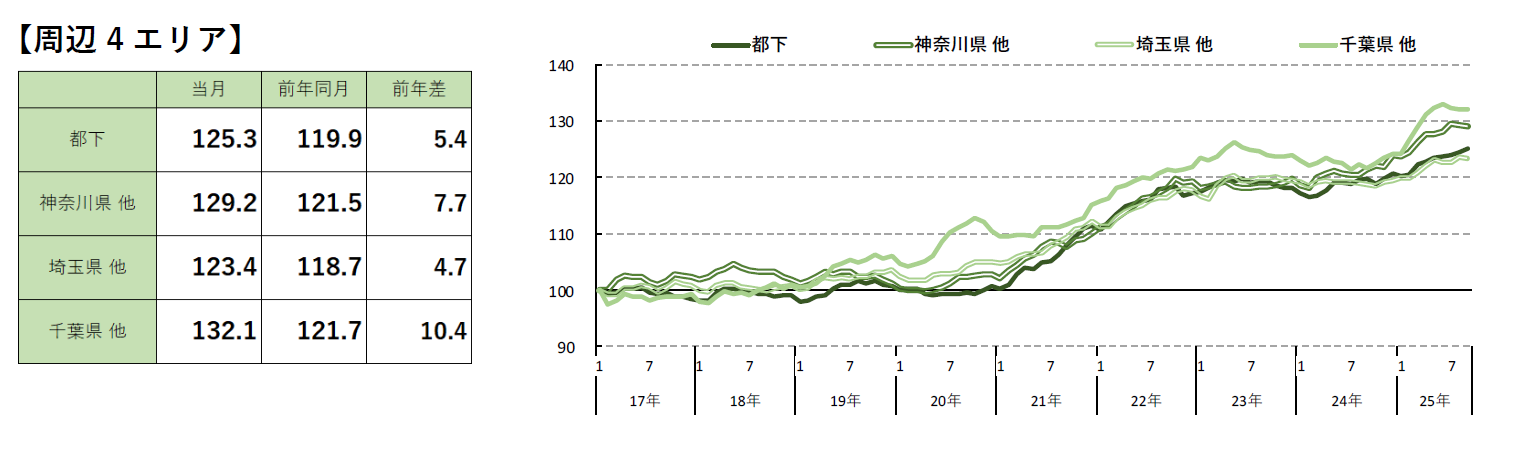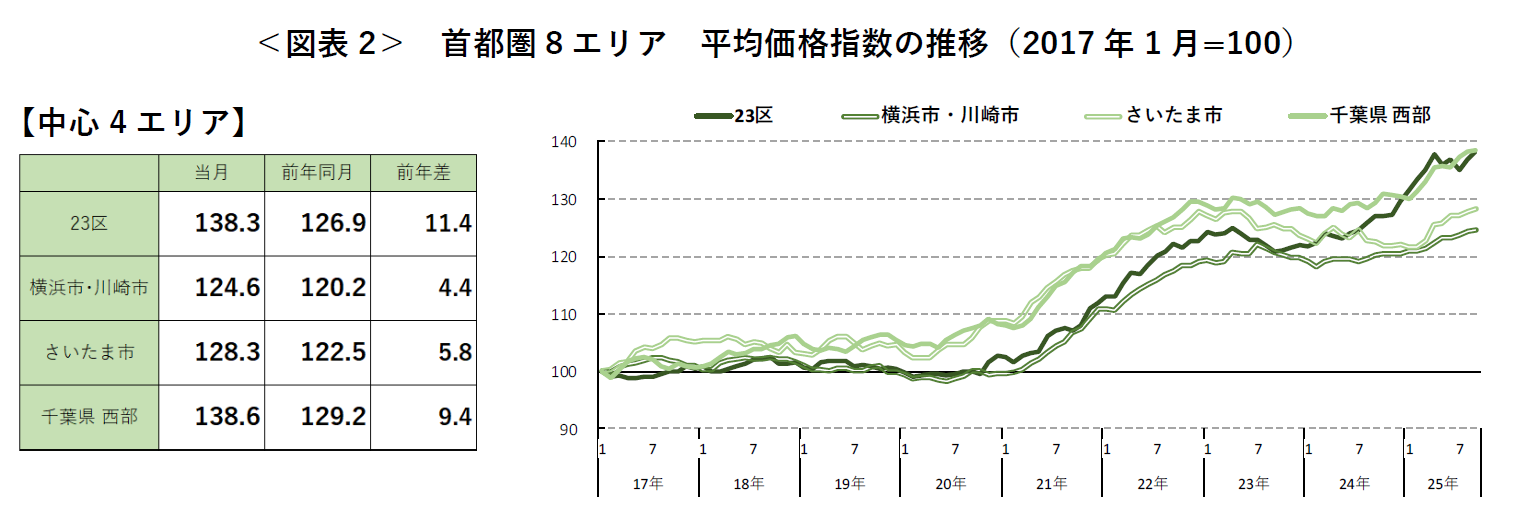 ◆ 東京都(23 区/都下)、横浜市・川崎市、さいたま市、千葉県西部の5 リアで2017年1 以降最高額を更新。
