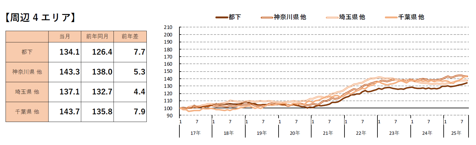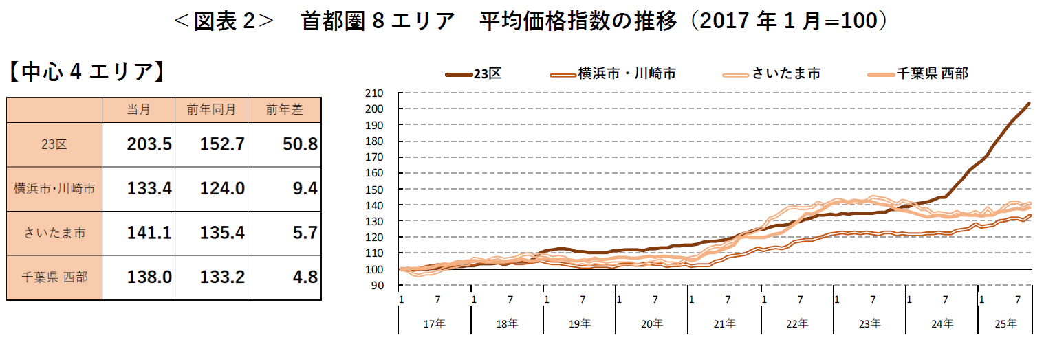 ◆東京都(23区/都下)、横浜市・川崎市、千葉県他の4エリアは2017年1月以降最高額を更新。