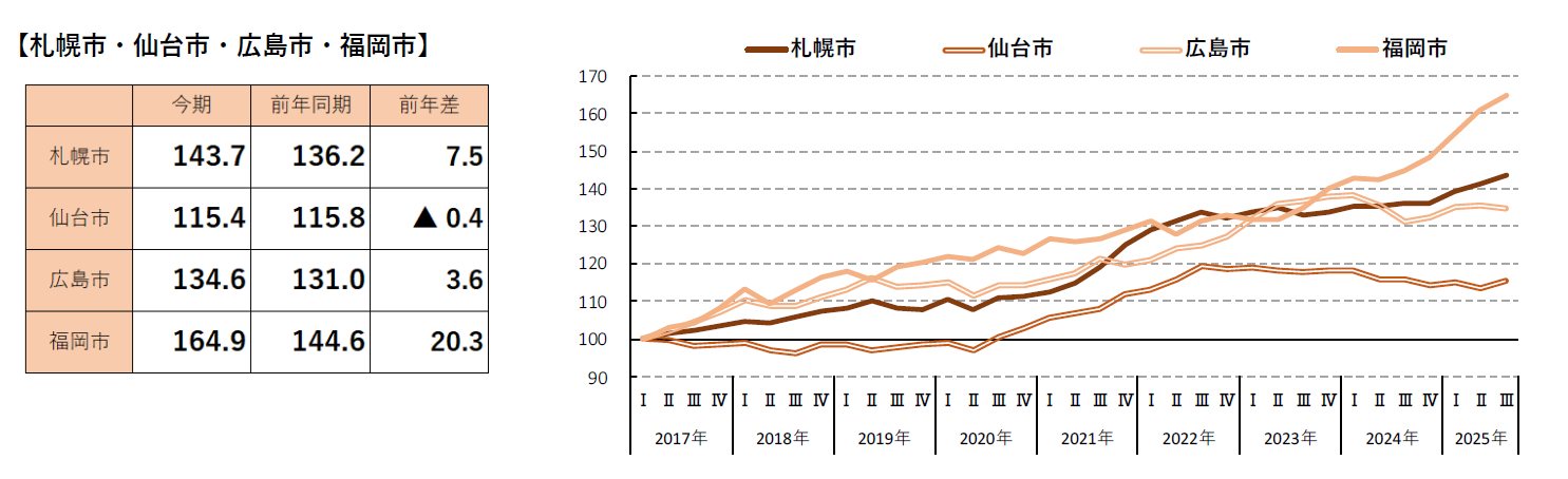 ◆前期比は大阪市が8期連続上昇、広島市は下落。前年同期比では仙台市が下落。