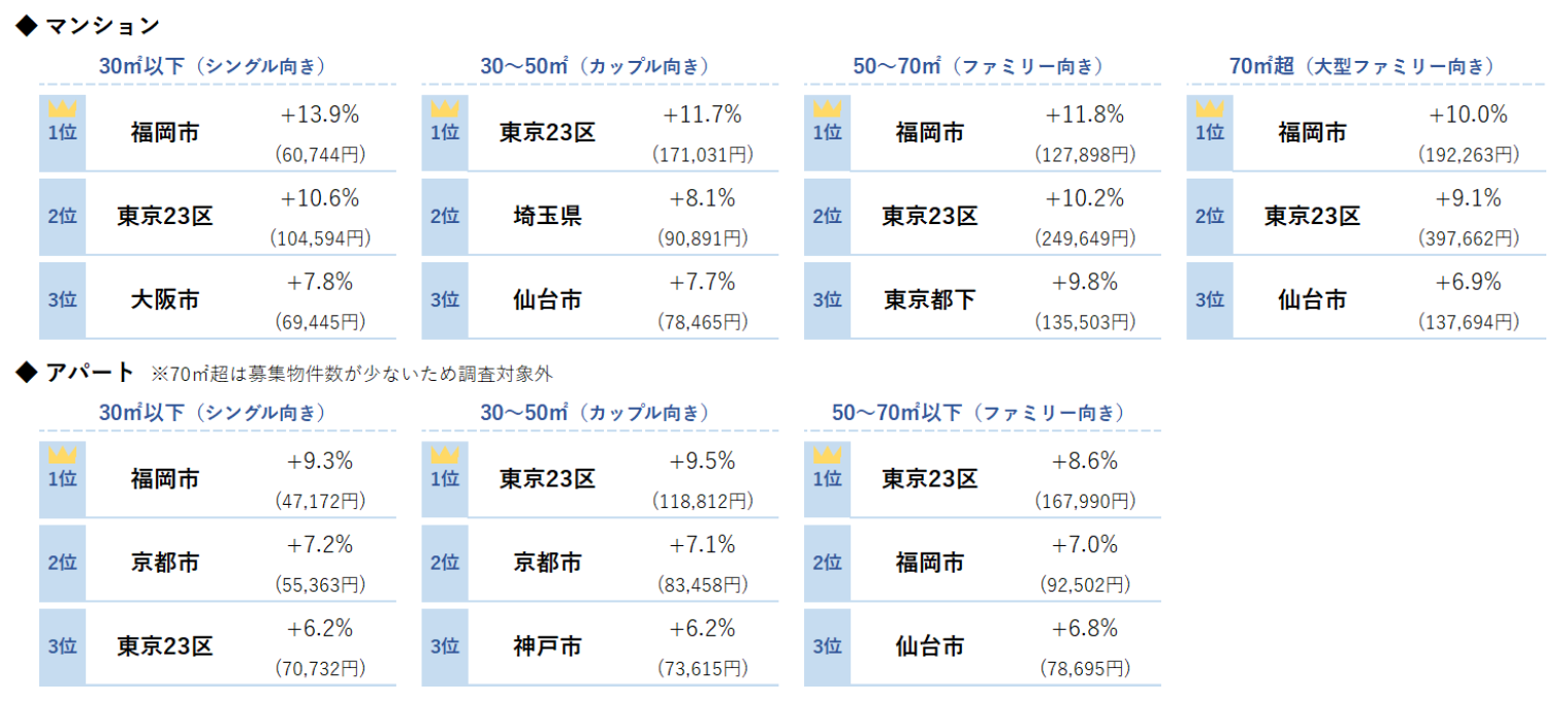 シングル向きでは東京23区が17カ月連続、大阪市が15カ月連続で最高値を更新し、