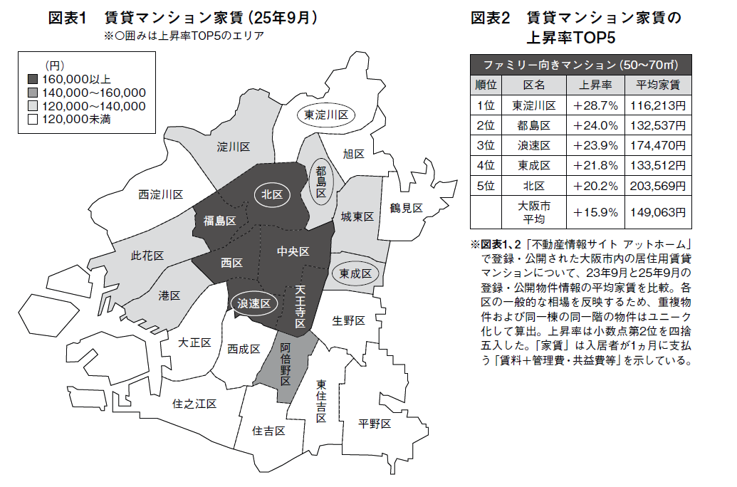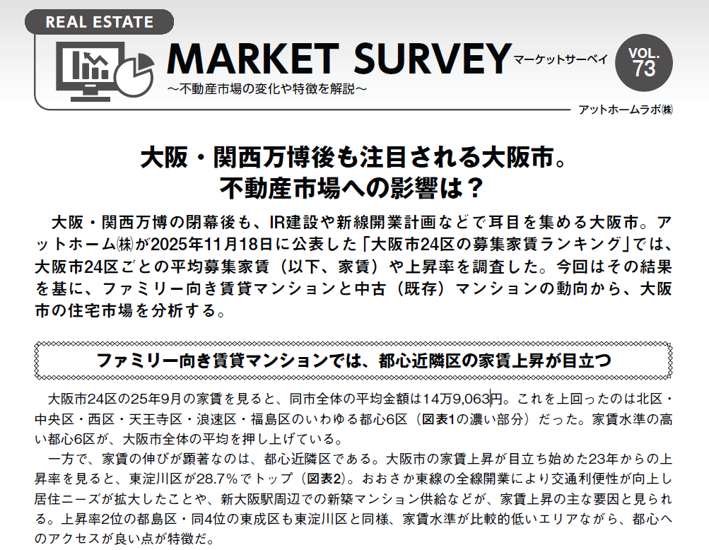 不動産業専門ビジネス誌「月刊不動産流通2月号(不動産流通研究所)」に 連載コラム「REAL ESTATE MARKET SURVEY」が掲載されました。 今回は、アットホーム㈱が2025年11月18日に公表した「大阪市24区の募集家賃ランキング」を基に、 ファミリー向き賃貸マンションと中古(既存)マンションの動向を分析しました。