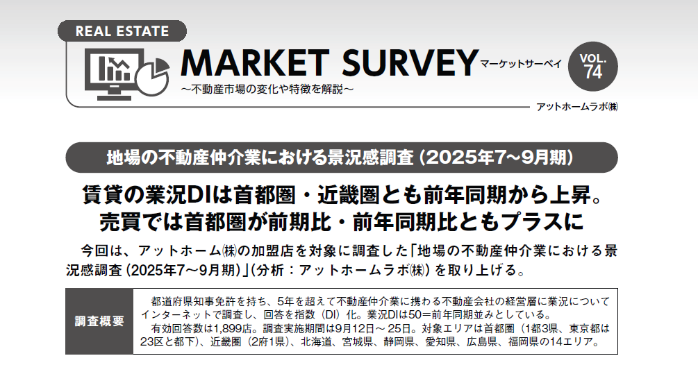 不動産業専門ビジネス誌「月刊不動産流通3月号(不動産流通研究所)」に 連載コラム「REAL ESTATE MARKET SURVEY」が掲載されました。 今回は、アットホーム(株)の加盟店を対象に調査した 「地場の不動産仲介業における景況感調査(2025年7~9月期)」を取り上げました。