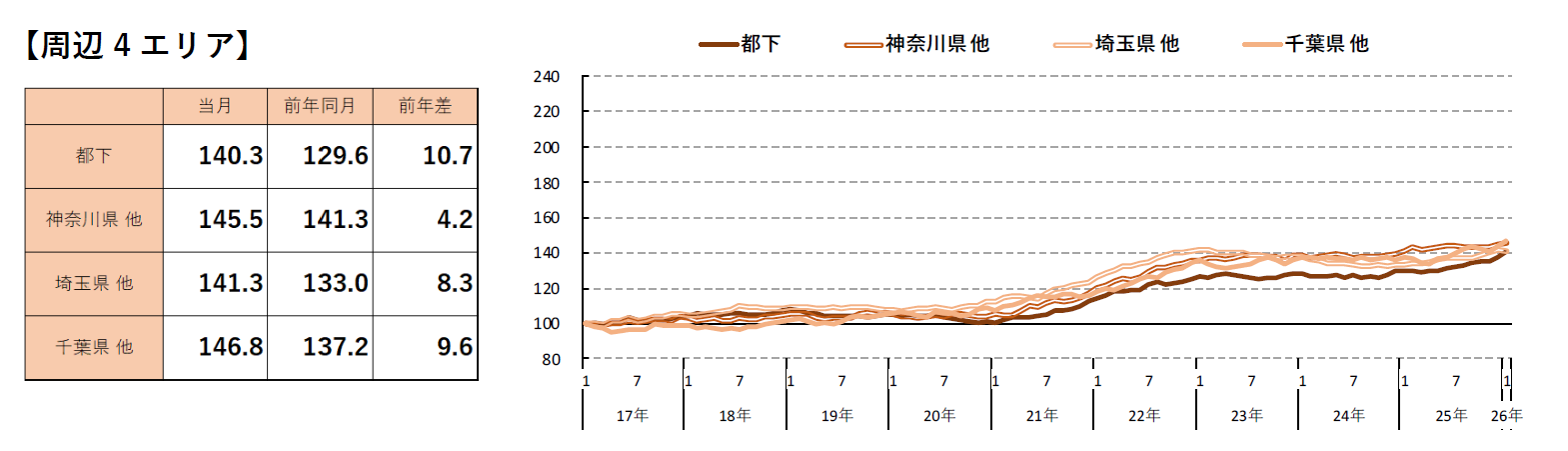 ◆東京都(23区/都下)、神奈川県(横浜市・川崎市/他)、千葉県他は2017年1月以降最高額を更新。
