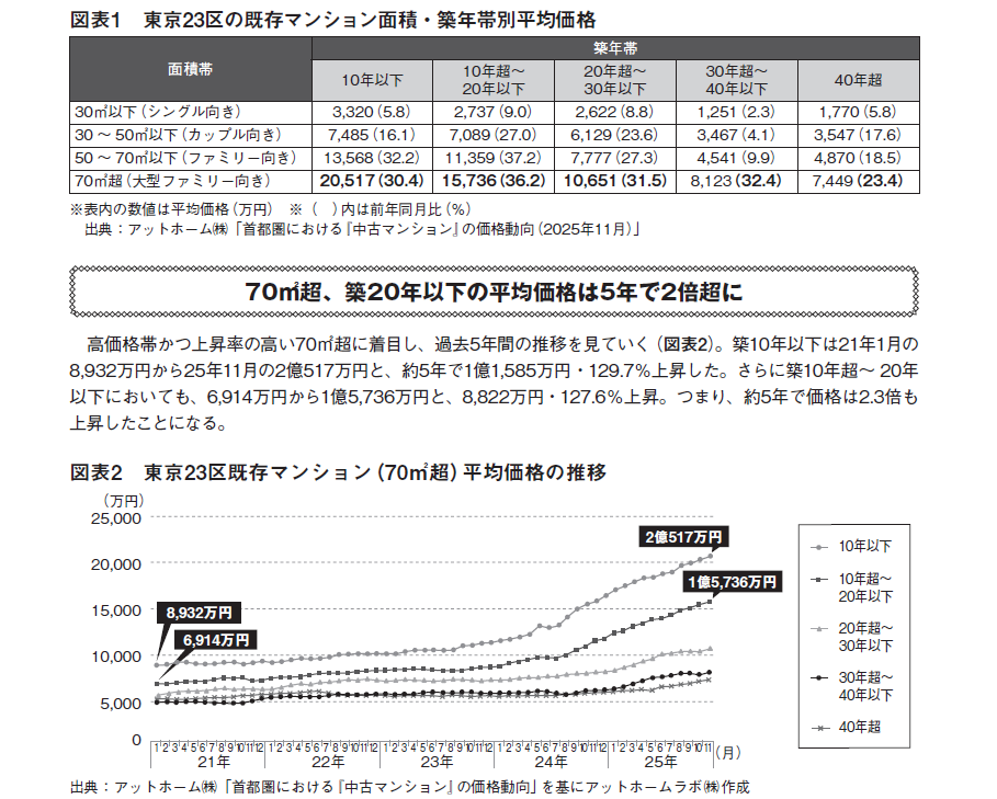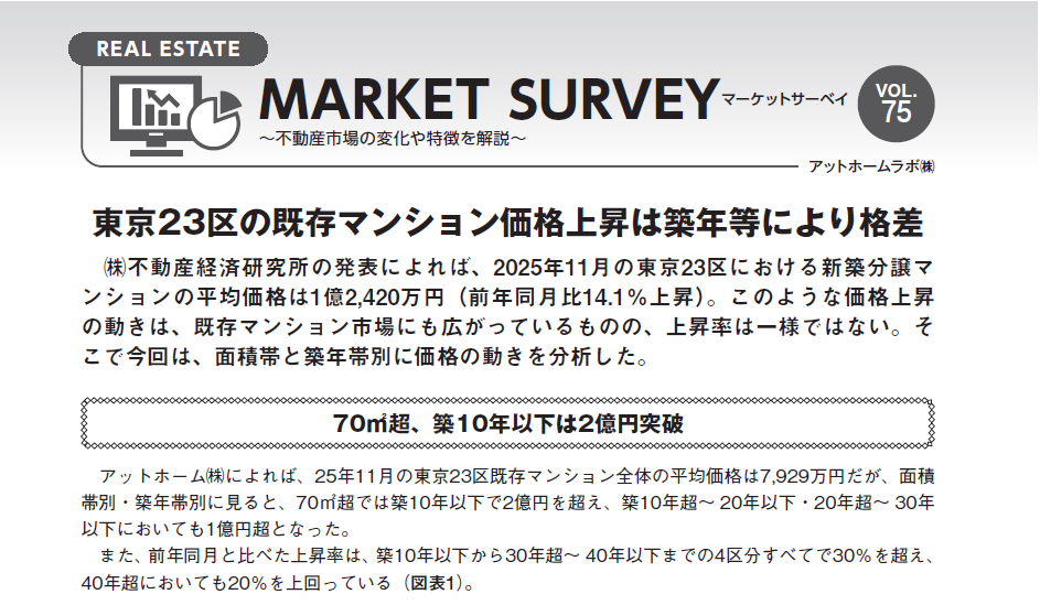 不動産業専門ビジネス誌「月刊不動産流通4月号(不動産流通研究所)」に 連載コラム「REAL ESTATE MARKET SURVEY」が掲載されました。 今回は、東京23区の既存マンションについて面積帯と築年帯別に価格の動きを分析しました。