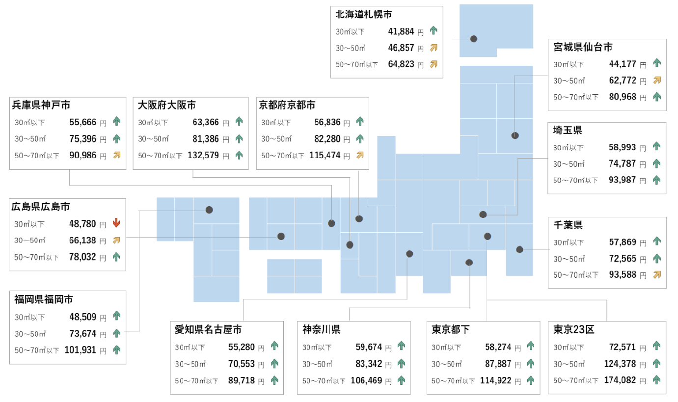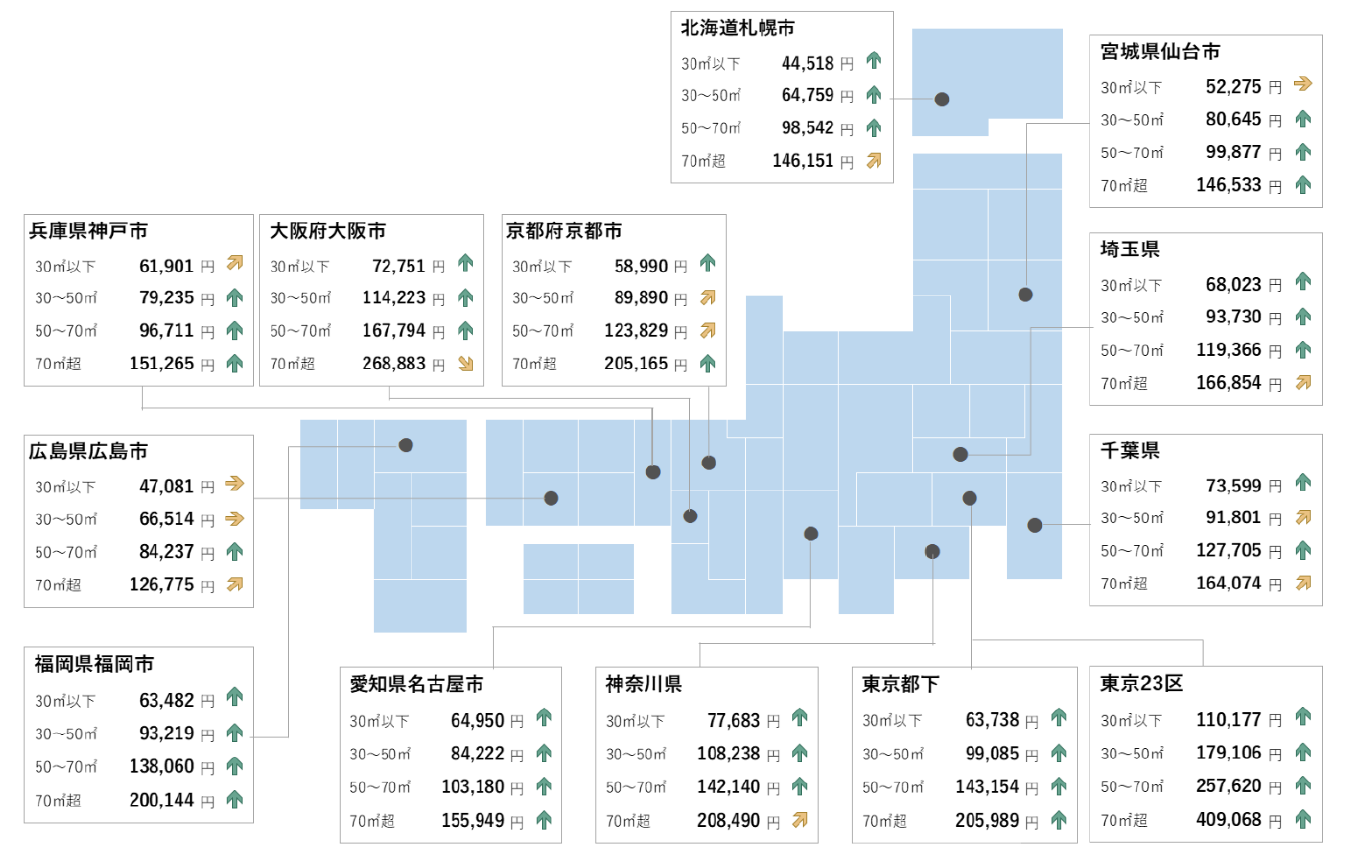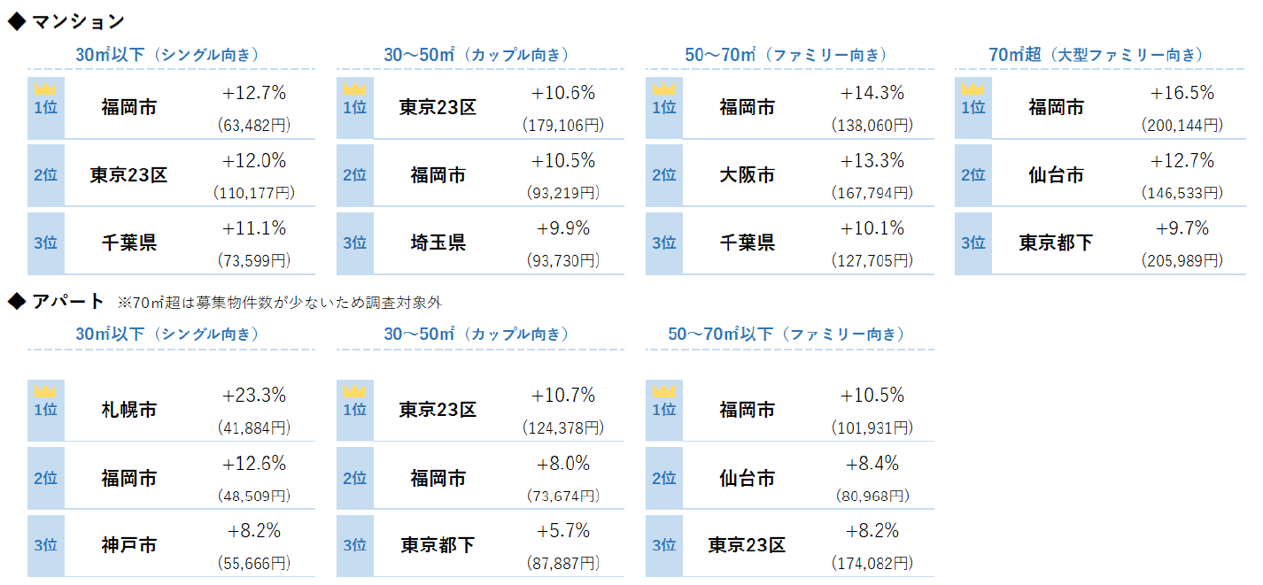 シングル向きでは東京23区が21カ月連続、大阪市が19カ月連続で最高値を更新。