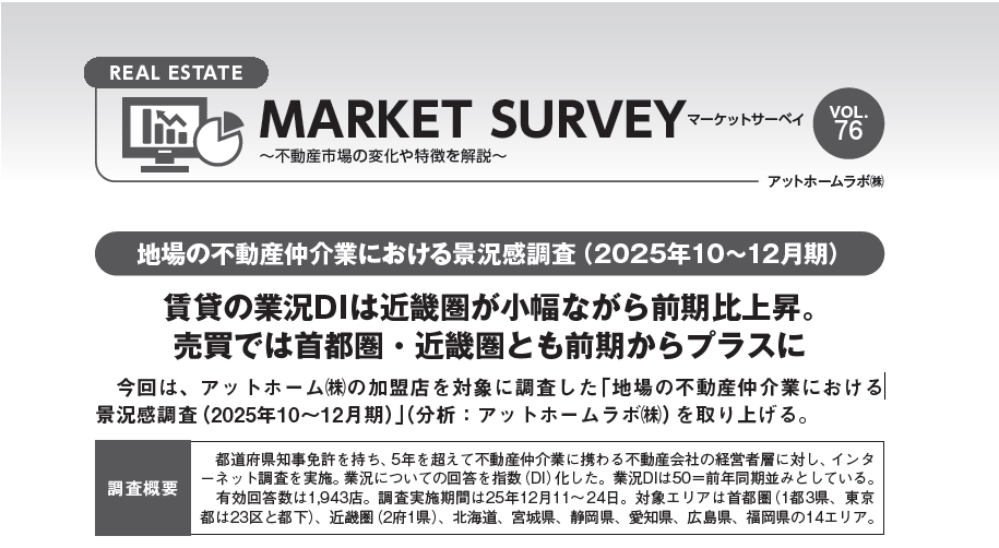 不動産業専門ビジネス誌「月刊不動産流通5月号(不動産流通研究所)」に 連載コラム「REAL ESTATE MARKET SURVEY」が掲載されました。 今回は、アットホーム(株)の加盟店を対象に調査した 「地場の不動産仲介業における景況感調査(2025年10~12月期)」を取り上げました。